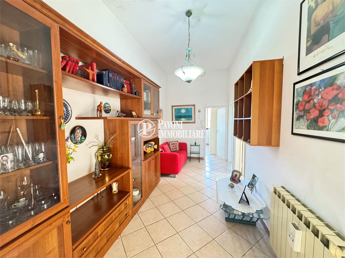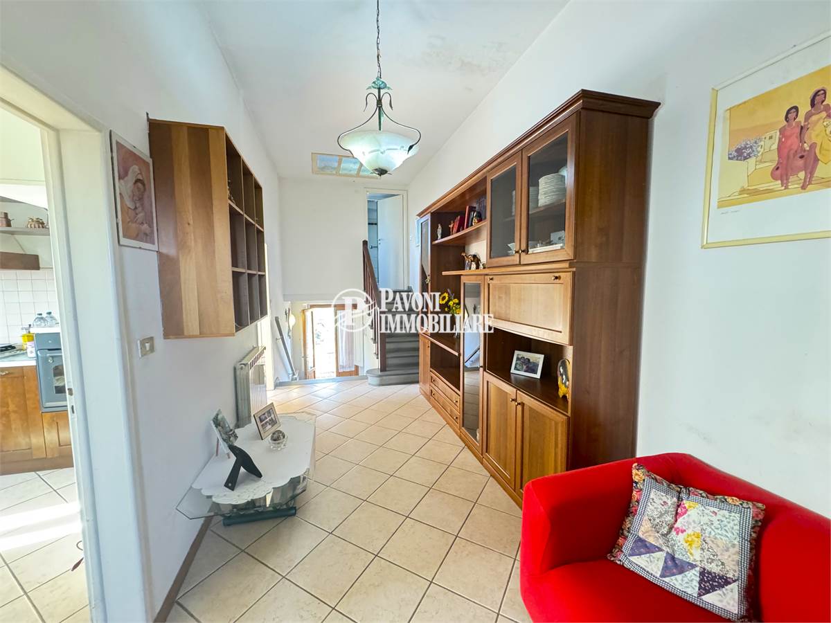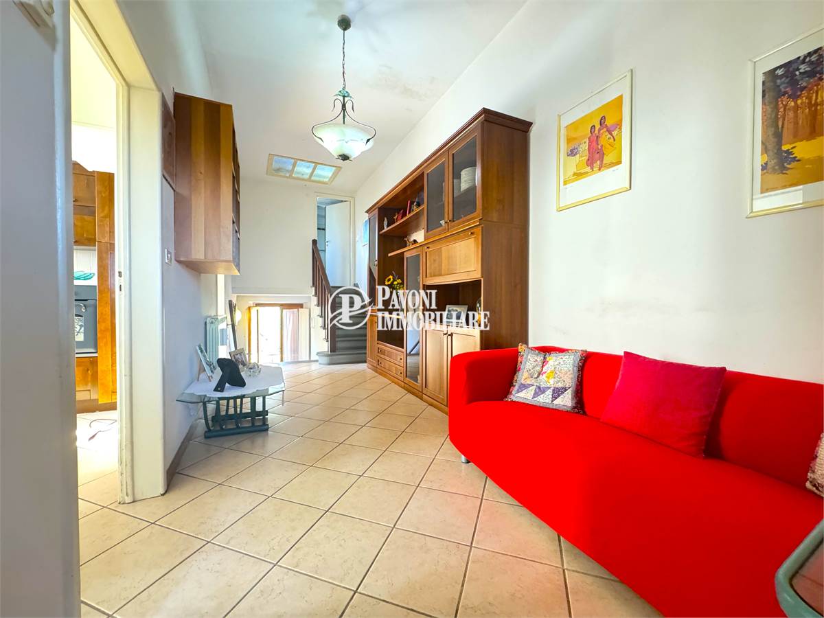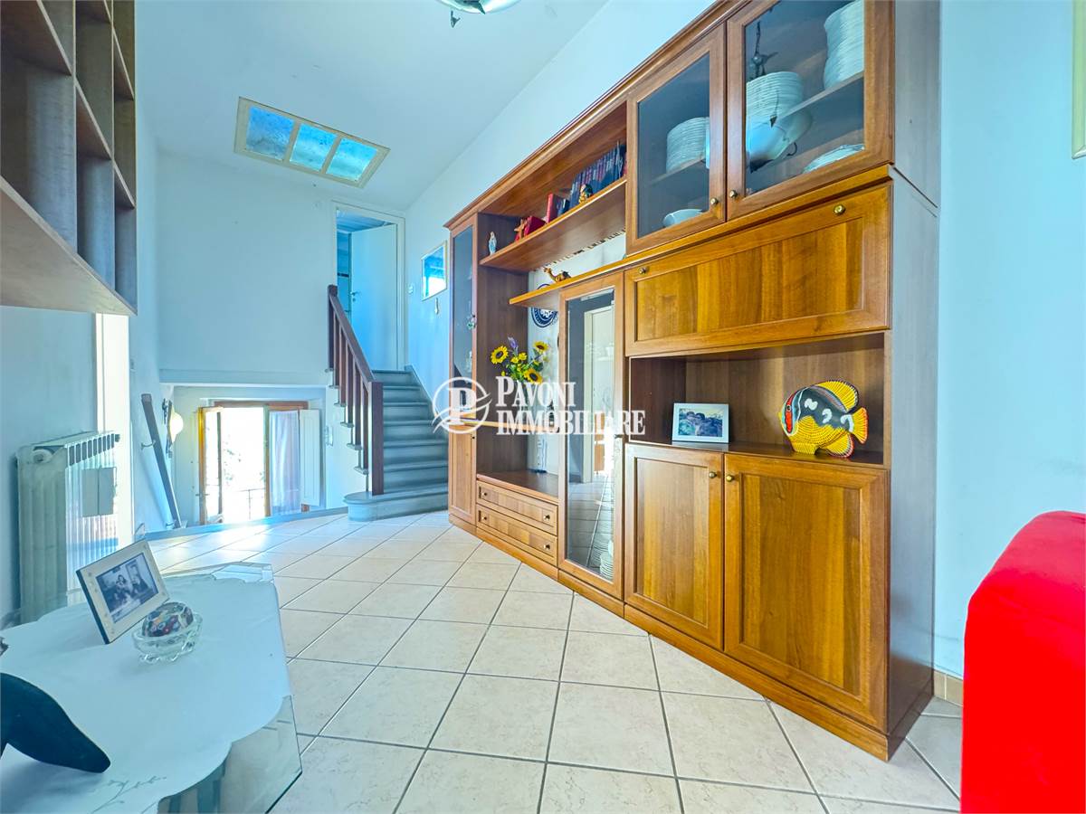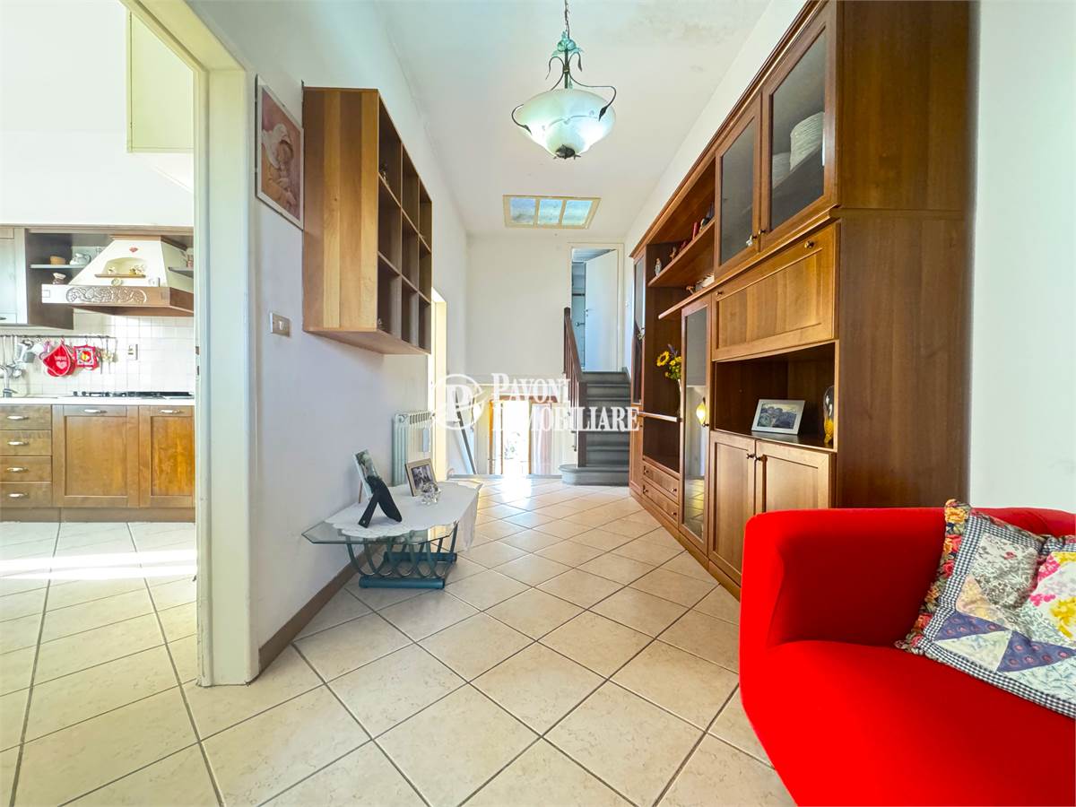 Entrando troviamo un piccolo disimpegno con scala in pietra che ci accompagna nella zona giorno. Il soggiorno attuale, conserva uno stile datato ma offre potenzialità.
