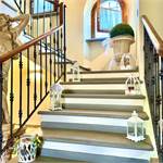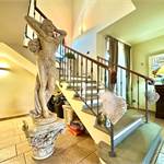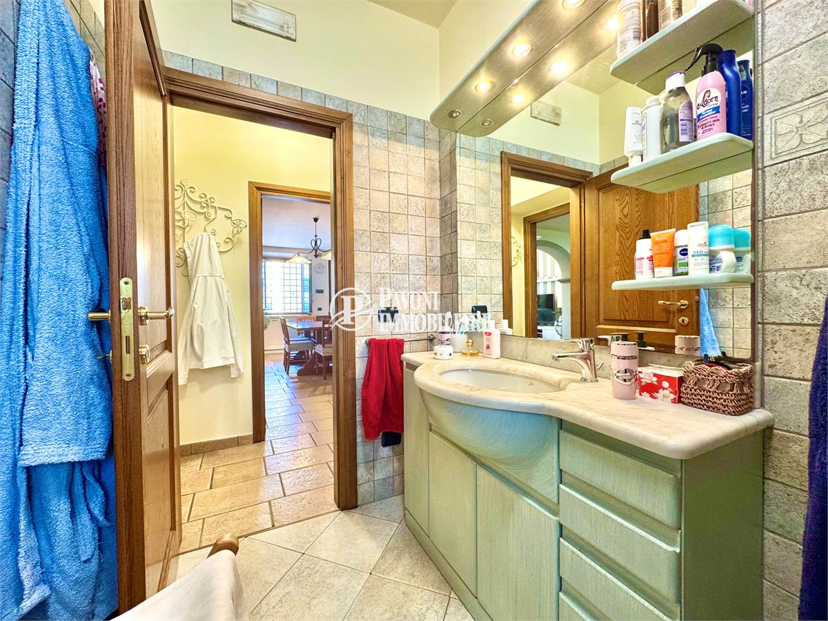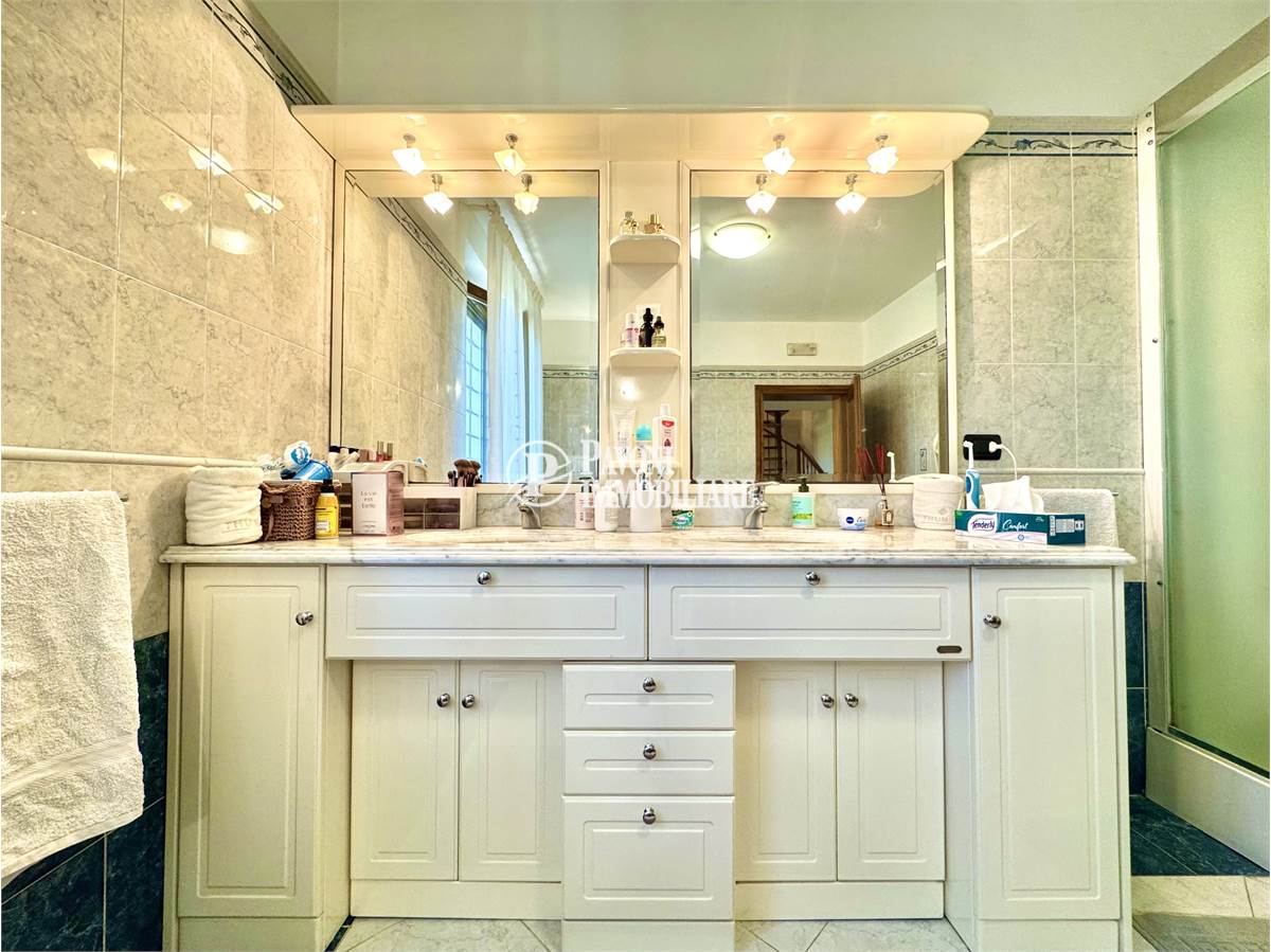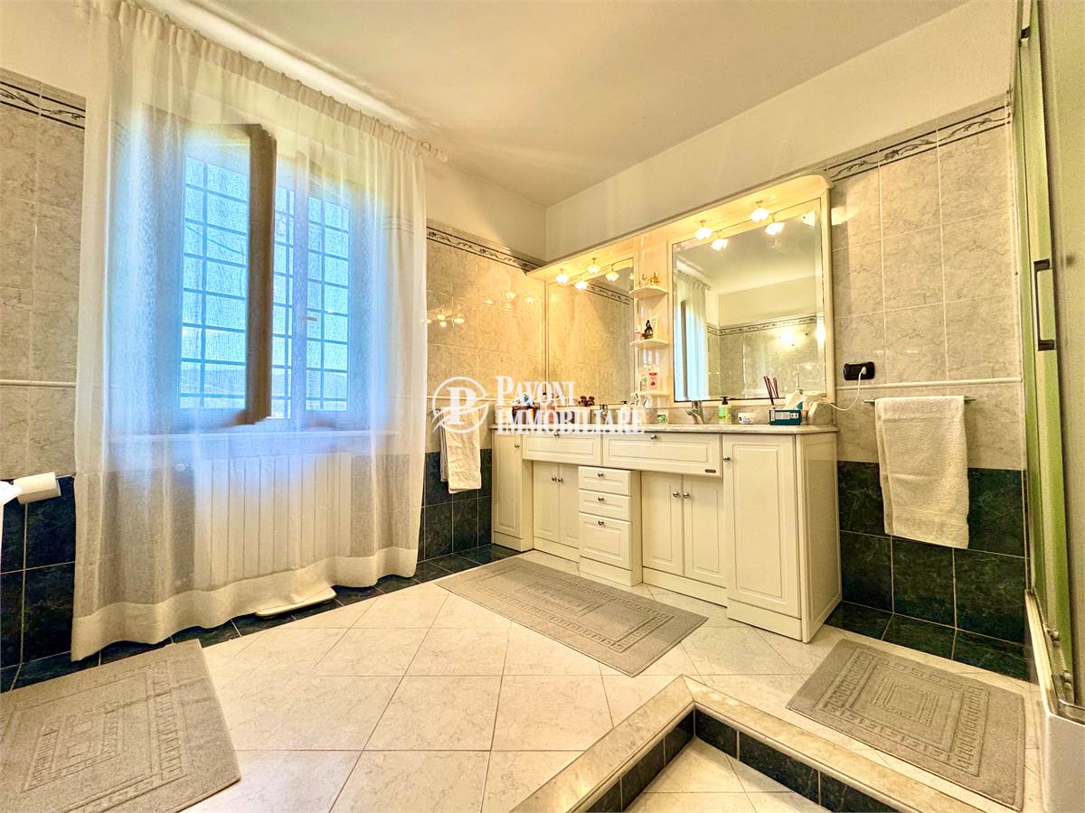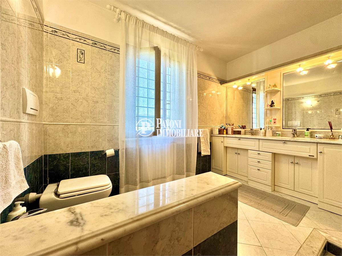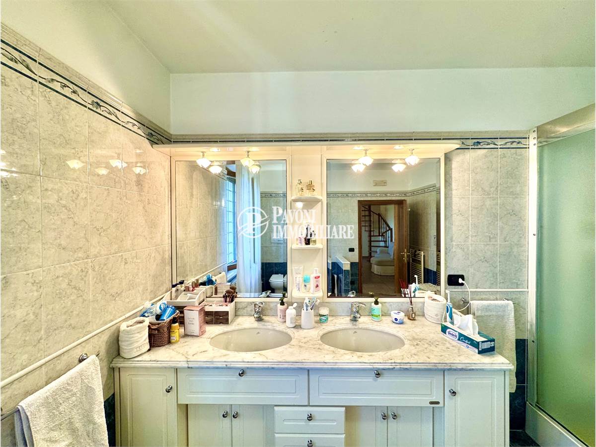 Salendo al primo piano troviamo un disimpegno che collega tre camere matrimoniali, tutte ben proporzionate e molto luminose. A servizio della zona notte ci sono due bagni finestrati, anch’essi rifiniti con materiali di qualità: uno dedicato alla camera padronale, dotata anche di una comoda cabina armadio, e uno per le altre due camere.