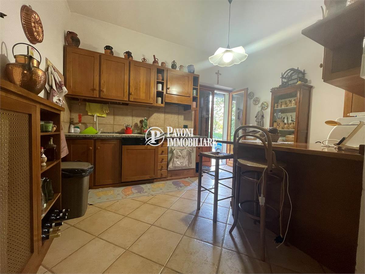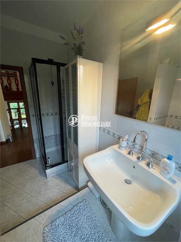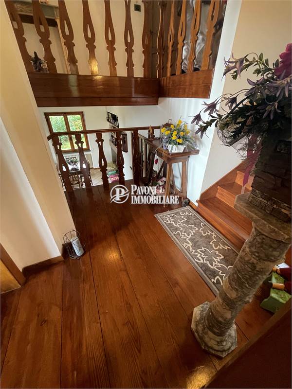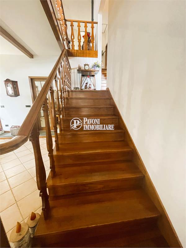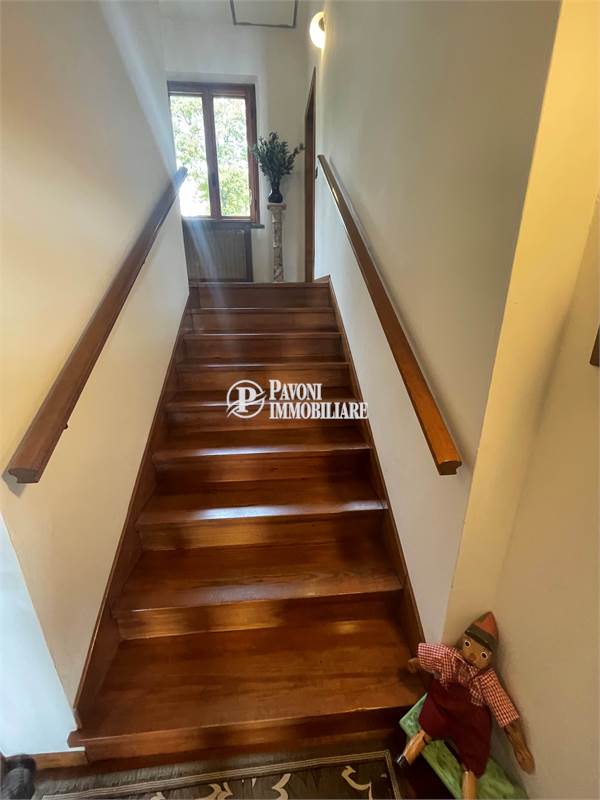 Entrando dalla porta principale, si accede a un ampio salone con camino, cuore della casa, dal quale si raggiungono la zona pranzo e la cucina, entrambe con accesso diretto al giardino. Dal salone, una raffinata scala in legno conduce al primo piano, dove troviamo tre camere matrimoniali – di cui una con balcone panoramico – un ampio disimpegno, una camerina/studio e due bagni.